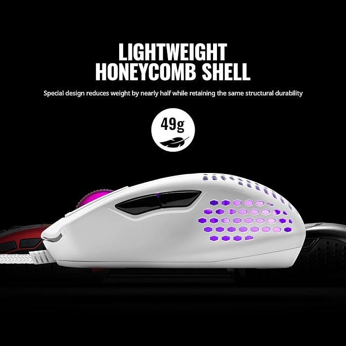 Lightweight Honeycomb Shell: Special design reduces weight by nearly half while retaining the same structural durabilityNew Ultraweave Cable: Super lightweight and engineered in-house to prevent cable snag when swipingGaming-Grade Hardware: Optical sensor adjustable up to 32000 DPI and durable switches graded for 20 million pressesClassic Ergonomic Shape: Wide, classic right-handed shape for claw grip, with a finger rest for added comfortCustomizable Through Software: Easily adjust RGBs, profiles, and macros through simple, straightforward software